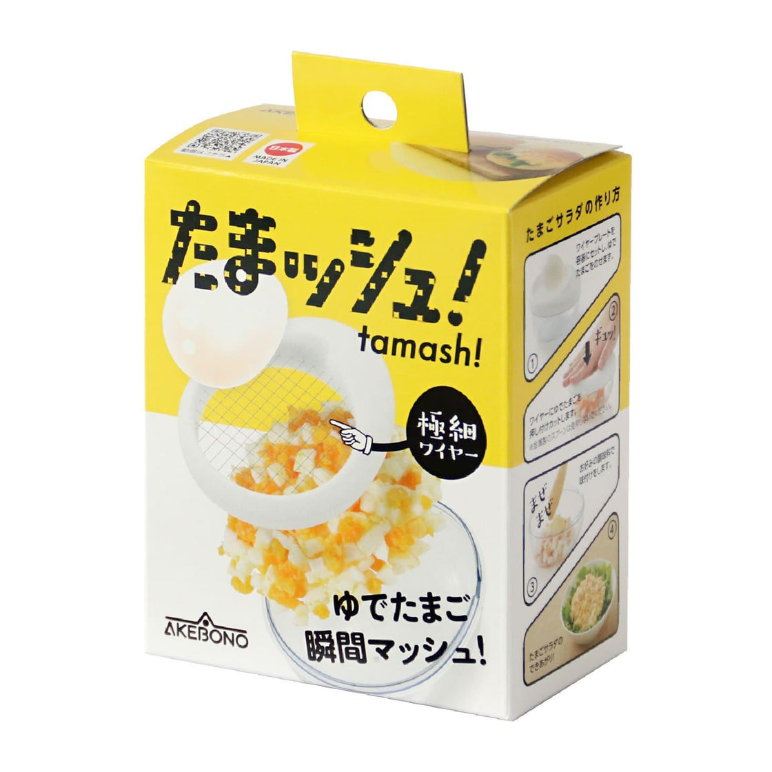 アケボノのこの卵潰し器を使えば、最後の工程があっという間に終わり、自家製卵サラダサンドイッチやタルタルソースがあっという間に楽しめます!殻をむいたゆで卵を金網に押し付けるだけで、つぶした卵が下のボウルに落ちていきます。