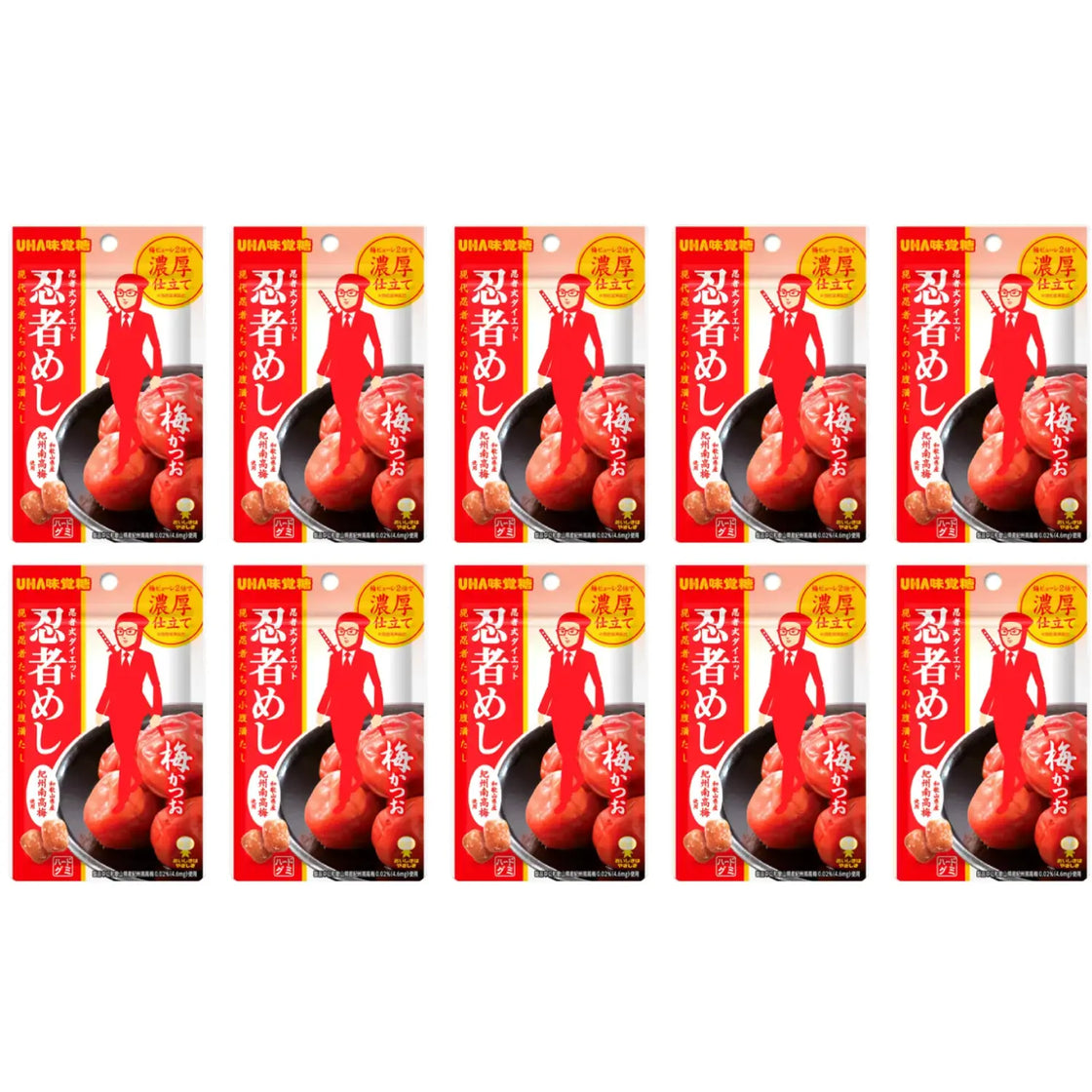 忍者めし梅かつおグミは、かつお節、昆布、梅など日本の代表的な食材で作られています。